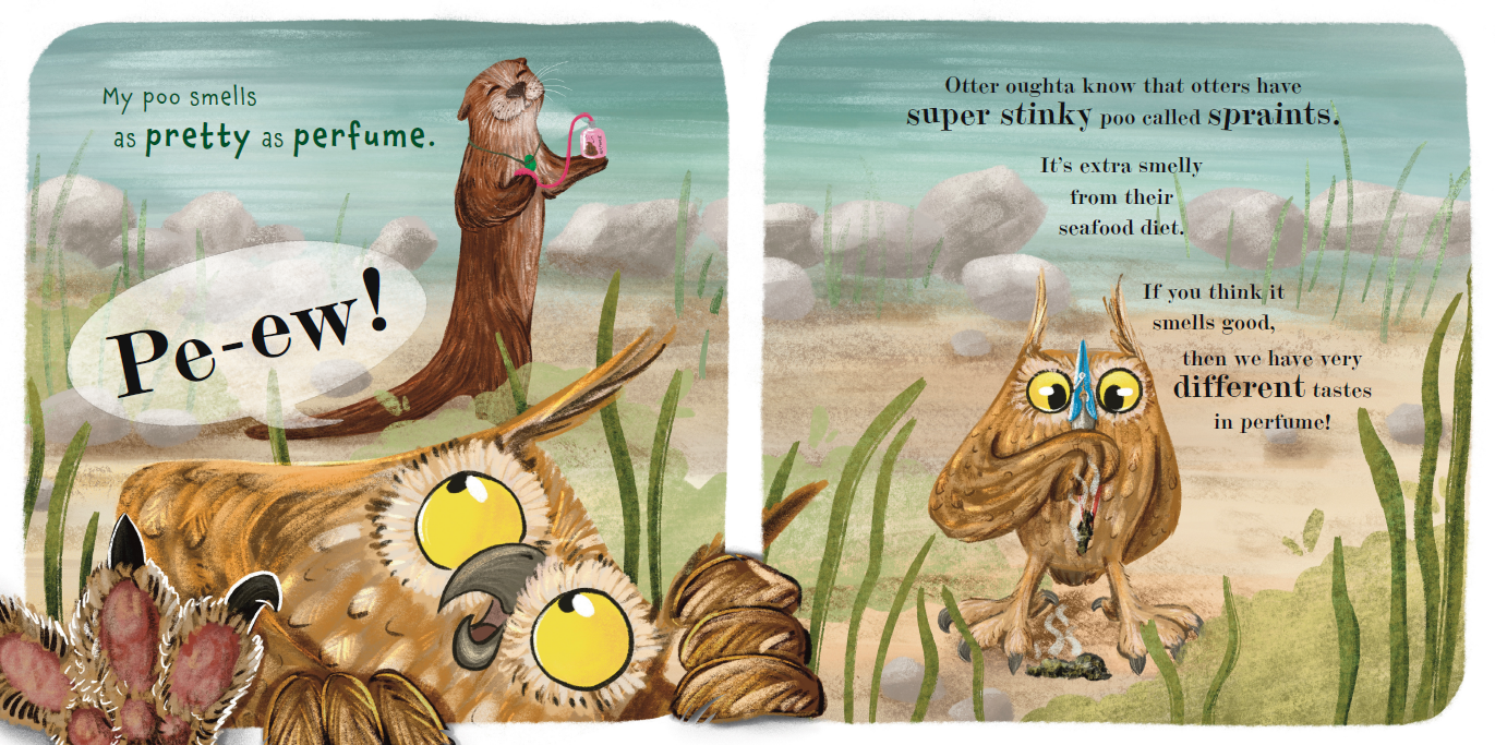 If you read both The Know It Owl and The Know It Owl and the Otter, you might have caught something that didn’t make ‘scents’. In the Owl book, it states that owls don’t have a sense of smell and that’s why they don’t mind catching skunks. Then, in the Otter book, Owl makes a big deal about how stinky Otter’s spraints are. That was a little bit of artistic license to offer a good fact and still make it funny to read about. There’s even a little nod to The Know It Owl spread where the skunk breaks through the 4th wall by having Owl try to escape the smell here.